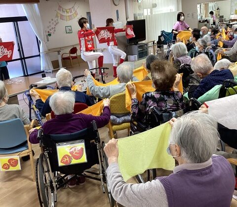 廿日市市女子社会人野球チーム「はつかいちサンブレイズ」の選手が応援健康ダンスを踊りに来てくださいました。→詳しくは「べにの里」へ