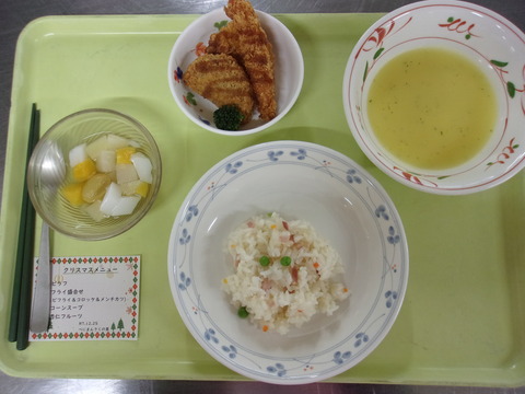 今年のクリスマス献立の紹介です 2025.12.28 12月25日は、クリスマス献立でした🎄~献立~・ピラフ・フライ盛り合わせ(エビフライ、コロッケ、メンチカツ)・コーンスープ・杏仁フルーツ詳しくは「べにの里」へ